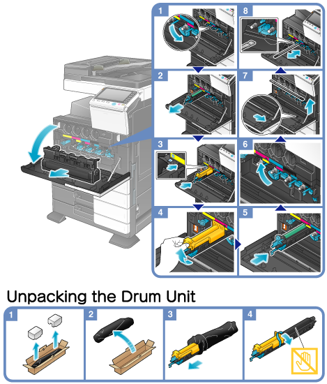 After replacing a Drum Unit, be sure to clean the Print Head Glass for each color. For details on how to clean the Print Head Glass, refer to Here.