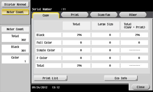 Tapping [Eco Info] allows you to check the ratio of color print jobs to all print jobs, and the ratio of paper saving as a result two-sided printing or the page combine function, and a transition of power consumption.