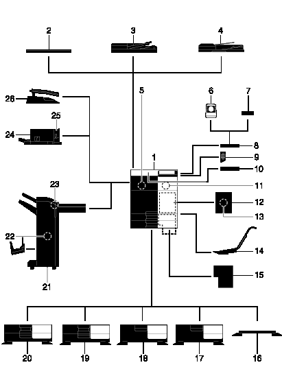 21 | Finisher FS-534 | Sorts, groups and staples printed paper before outputting it. To install Finisher FS-534, Desk DK-510, Paper Feed Cabinet PC-410, Paper Feed Cabinet PC-110, or Paper Feed Cabinet PC-210 must be installed onto this machine. |