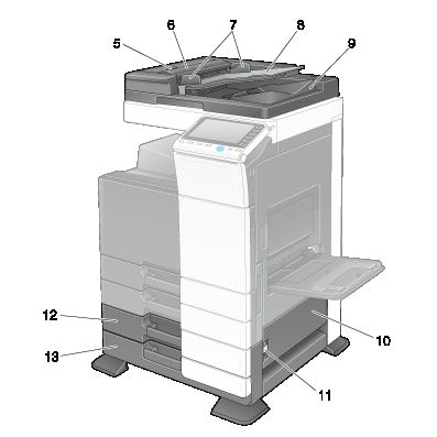 13 | Tray4/Storage Box | Used as a Storage Box when installing Single Paper Feed Cabinet. This box allows you to load up to 500 sheets when Double Paper Feed Cabinet is installed. This tray can hold up to 150 sheets of Thick 1, Thick 1+, Thick 2, and Thick 3. |