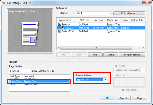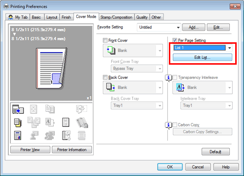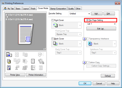 To print chapter covers on a different type of paper, select the [Per Page Setting] check box on the [Cover Mode] tab.