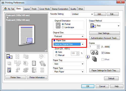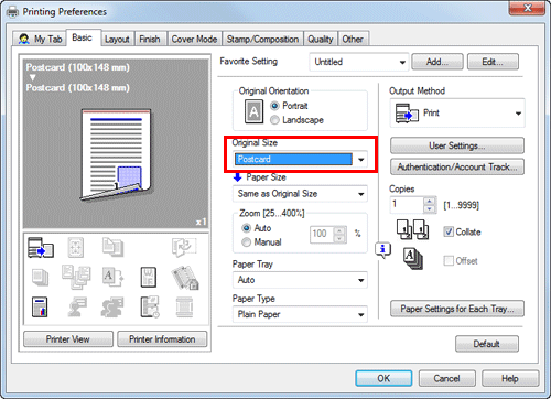 In [Original Size] on the [Basic] tab, select [Envelope] or [Postcard].