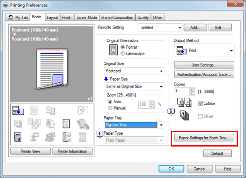 If the paper setting of [Bypass Tray] in this machine is the same as that of [Original Size] in step 3 or [Paper Type] in step 7, printing starts without further setting.