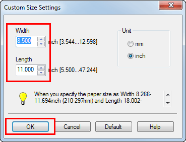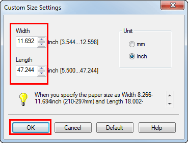 Enter values for [Width] and [Length] of the paper for printing, then click [OK].