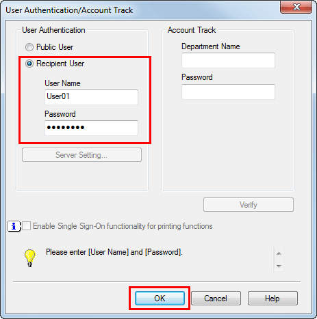 Select [Recipient User], enter the [User Name] and [Password] that are registered with the machine, then click [OK].