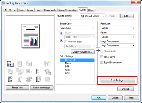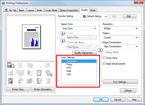 In [Color Settings] on the [Quality] tab, select the type of the document to print.