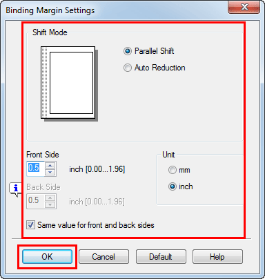 [Front Side]/[Back Side] | Enter the width of the page margin. For 2-sided printing, clearing the [Same value for front and back sides] check box allows you to specify different values for the front and back sides. |