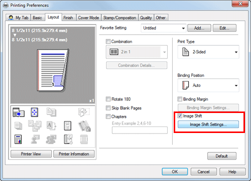 To enable image shift, select the [Image Shift] check box on the [Layout] tab and click [Image Shift Settings].