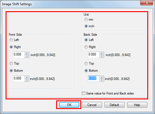 [Front Side]/[Back Side] | Set the direction and the value for shifting the printing position. For 2-sided printing, select the [Same value for Front and Back sides] check box allows you to specify the same value for the front and back sides. |