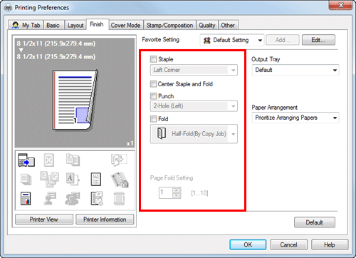 Select the check box for the desired finish on the [Finish] tab. If you have selected the [Staple], [Punch] or [Fold] check box, specify the quantity, positions and other necessary settings.