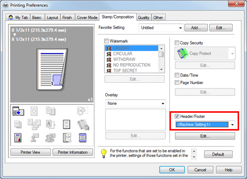 On the [Stamp/Composition] tab, select the [Header/Footer] check box, then select information to print out.