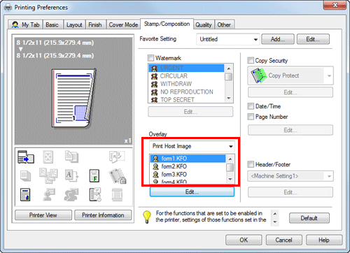 To print a document over an output of a file created on a computer, select [Print Host Image] from [Overlay] on the [Stamp/Composition] tab, then select the file for overlay printing.