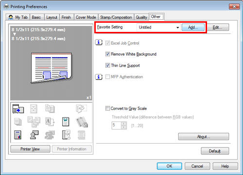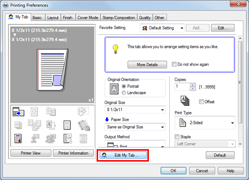 A15. Yes. You can easily customize the window from the properties window of the printer driver by registering frequently used functions en masse on My Tab or registering settings for respective tabs as your favorite for quick activation.