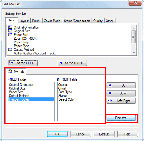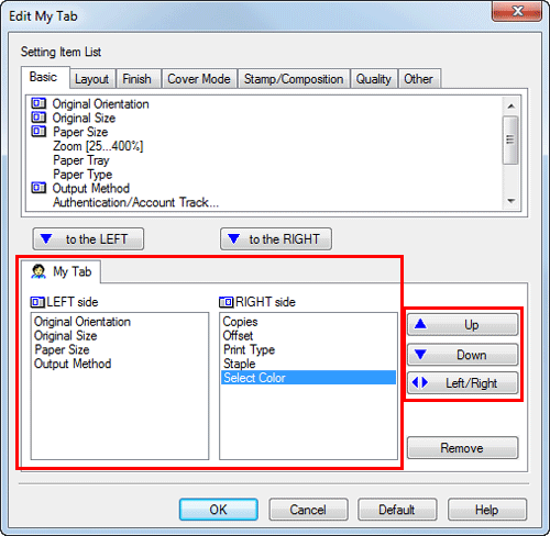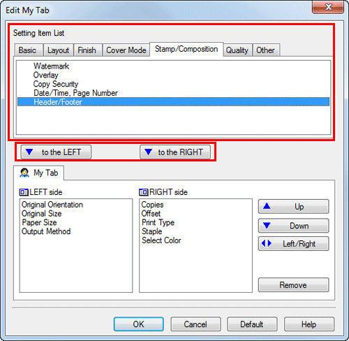 To register functions on My Tab, select the functions to register from [Setting Item List] and click [to the LEFT] or [to the RIGHT].