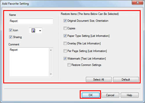 [Restore Items] | Select the box of each item to be reflected on the settings on the properties window when the favorite setting is restored. |