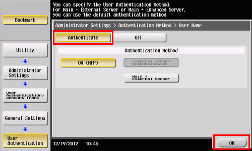 The authentication status may be [ON (MFP)], [External Server Authentication], [Main + External Server], [Enhanced Server Authentication], or [Main + Enhanced Server] authentication. For information on server-based user authentication, contact the server administrator.