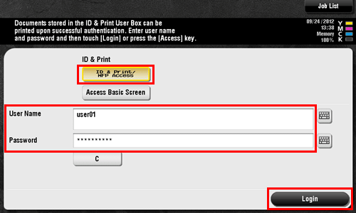 Select [ID & Print/MFP Access], enter your user name and password, then tap [Login].
