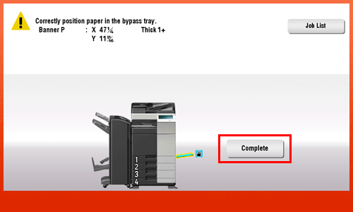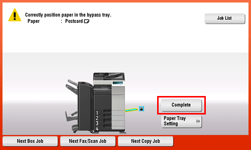 If you cannot tap [Complete], remove the envelopes or postcards loaded in the Bypass Tray and reload them, then tap [Complete].