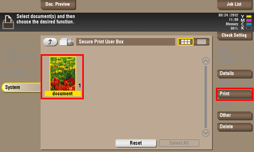 The secure print document is printed and automatically cleared from the Secure Print User Box.