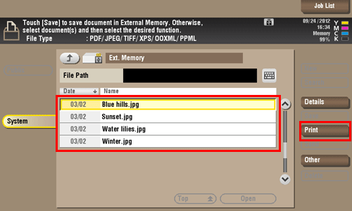 See the table below for the types of files that can be printed and the operating conditions of the USB memory.