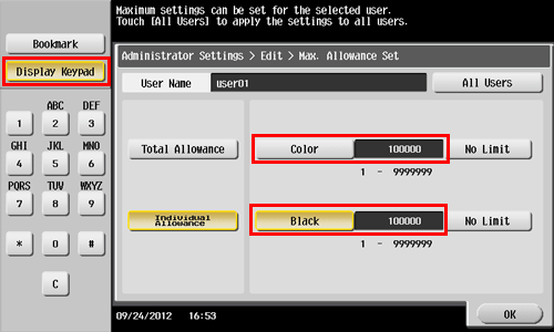 Tap [Max. Allowance Set] and [Color] or [Black], then enter the maximum allowance for the number of color/black originals that the user can print, using the Keypad.