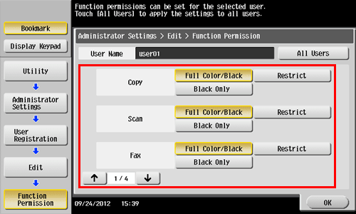 To manage the upper limit without distinguishing between the color and black originals, tap [Total Allowance]. Then, tap [Total], enter the upper limit using the Keypad, and tap [OK].