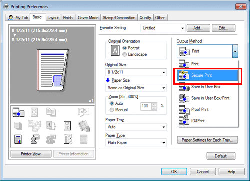 In [Output Method] on the [Basic] tab, select [Secure Print].
