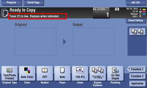 When toner is running out in Toner Cartridge, a message appears as shown below (at replacement by user).