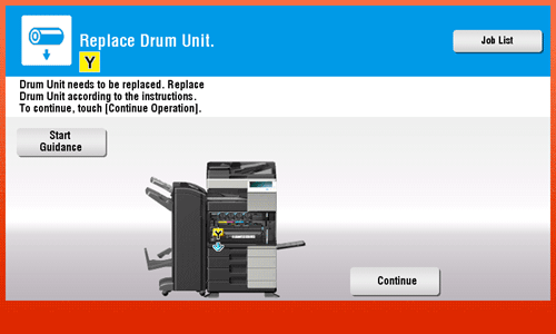 When the replacement time has come for the Drum Unit, the following message appears (at replacement by user). Tap [Start Guidance], then follow the displayed guidance to take an action.