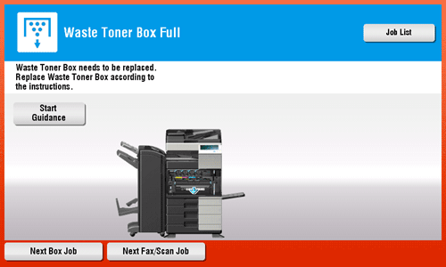 When the Waste Toner Box is full, the following message appears (at replacement by user). Tap [Start Guidance], then follow the displayed guidance to take an action.