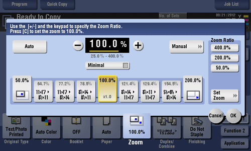 • [Zoom]: Specify the finished size after the image is enlarged according to the zoom ratio. When you join the copied sheets at overlap margins, the finished size is the same as the specified zoom ratio. The required number of print sheets depends on the zoom ratio you have specified.