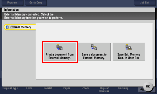 You can also print files by selecting the User Box operation mode and by tapping [System] - [External Memory].
