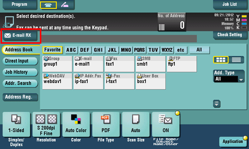 Tap [E-mail RX] to inquire the mail server. If there is an incoming E-mail, receive it and print its attachment.