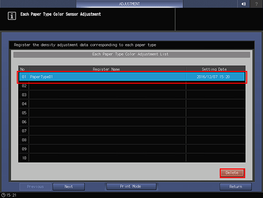 Select a row you wish to delete from Each Paper Type Color Adjustment List, and press Delete.
