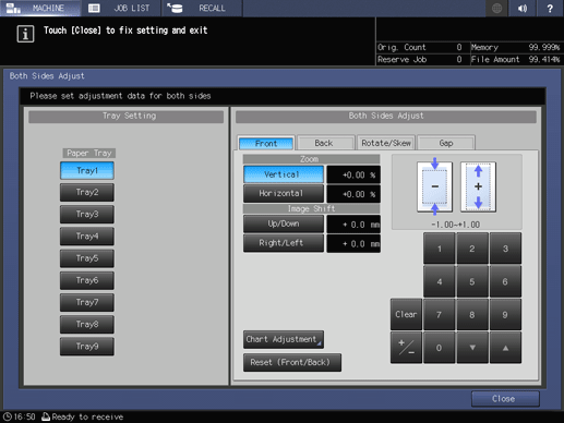Press Both Sides on the MACHINE screen to display the Both Sides Adjust screen. You can also display the screen from the Paper Setting screen by pressing the Paper Setting in the MACHINE screen or the COPY screen.