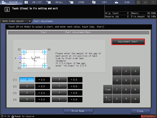 of [1] is misaligned leftward (plus side of X direction) by 2.0 mm and downward (minus side of Y direction) by 1.5 mm from the one on the front side as shown in the figure, press in order of 20+/- and enter -2.0 to correct and move rightward (minus side of X direction) the blue line on the back side by 2.0 mm in the X direction. And also press in order of 15 and enter +1.5 to correct and move upward (plus side of Y direction) by 1.5 mm in the Y direction.