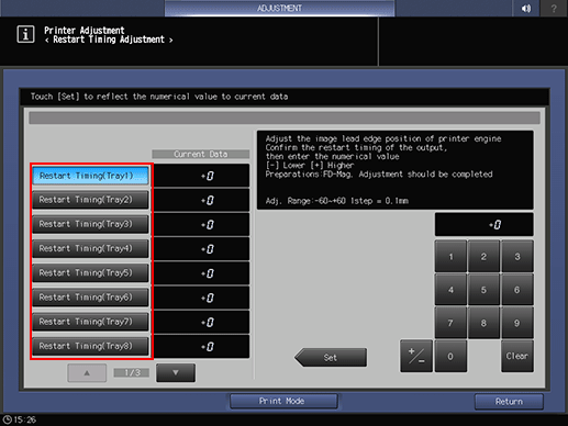 Objects of Adjustment: Restart Timing (Tray 1 to Tray 9), Restart Timing (Back), Tray Large Plain Offset, Tray Large Thick Offset, Tray Small Plain Offset, Tray Small Thick Offset, Large Plain Offset (ADU), Large Thick Offset (ADU), Small Plain Offset (ADU), Small Thick Offset (ADU)