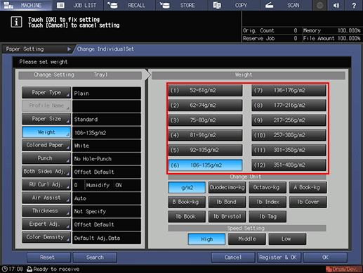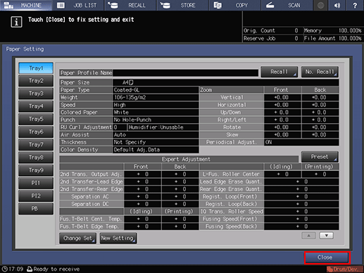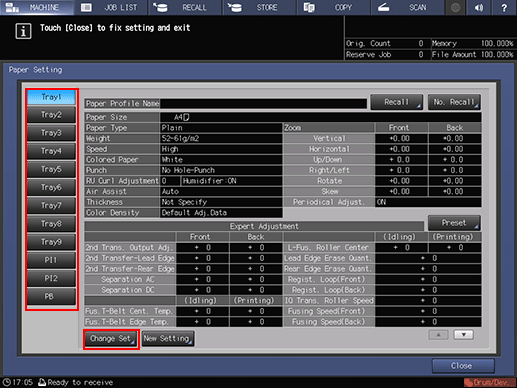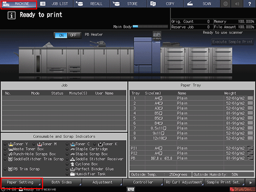 On the touch panel of the main body, press Paper Setting on the MACHINE screen.