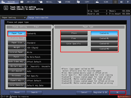 Example: Set the Paper Type to Coated GL, and the Screen Setting to Screen 1 (default).