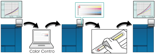 Measure the output density of C, M, Y, and K colors on a chart using the instrument, and give the results to the Controller as feedback. Based on this feedback, the Controller automatically calibrates the output density with reference to the predefined target density. This calibration enables output close to the target density.