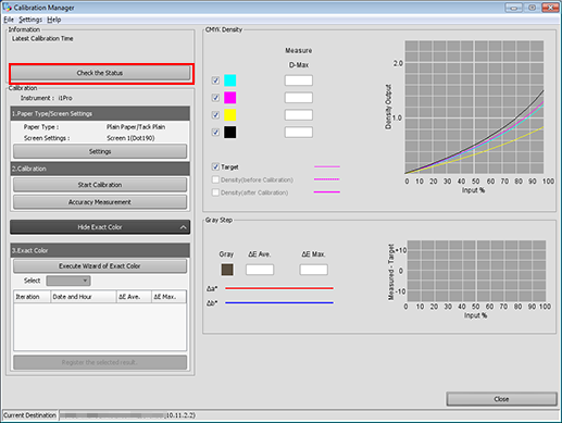 Check the graph display and other information on the Calibration Manager screen. After checking the displayed content, click Check the Status.