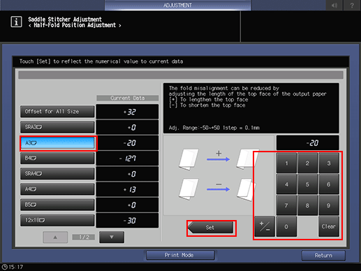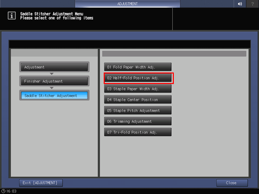 Press Half-Fold Position Adj. on the Saddle Stitcher Adjustment menu.