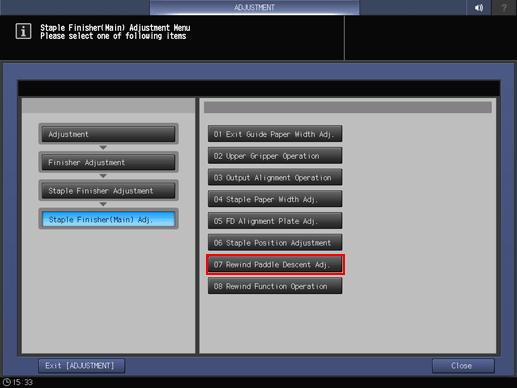 Press Finisher Adjustment, Staple Finisher Adjustment, Staple Finisher(Main) Adj., and Rewind Paddle Descent Adj. in sequence.
