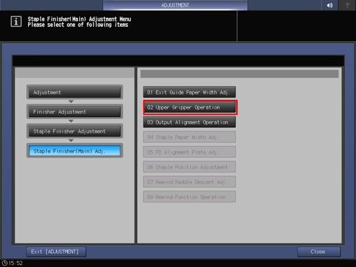 Press Finisher Adjustment, Staple Finisher Adjustment, Staple Finisher(Main) Adj., and Upper Gripper Operation in sequence.