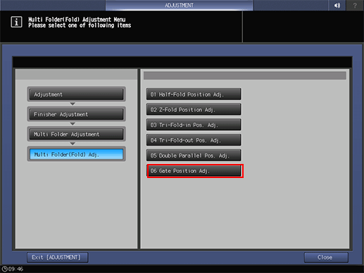 Press Finisher Adjustment, Multi Folder Adjustment, Multi Folder(Fold) Adj., and Gate Position Adj. in sequence.