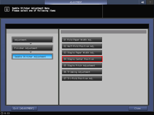 2. Press Finisher Adjustment, Saddle Stitcher Adjustment, and Staple Center Position in sequence.