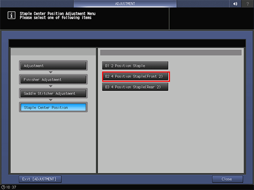 The screen returns to the Staple Center Position Adjustment Menu screen.