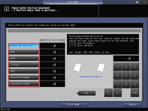 Objects of Adjustment: Offset for All Size, B4 short edge feed, 8K short edge feed, 11 17 short edge feed, A3 short edge feed, Custom (380 to 488 mm), Custom (257 to 379 mm)