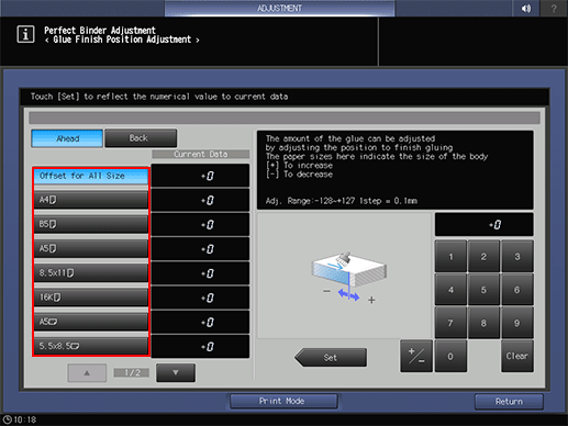 The screen returns to the Perfect Binder Adjustment Menu screen.