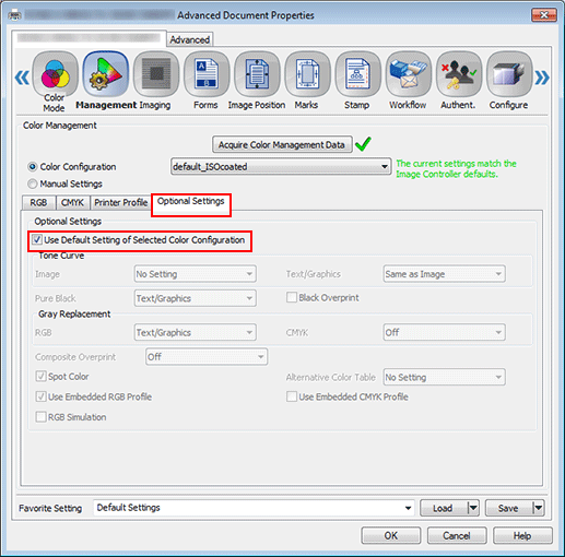 5. Click Optional Settings and clear Use Default Setting of Selected Color Configuration.